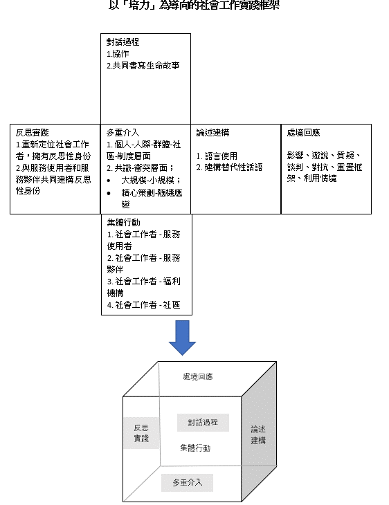 一個以培力為導向的社會工作實踐框架包括對話過程、反思實踐、論述建構、處境回應、集體行動和多重介入。這個框架可被視為具有六個相同面的立方體: